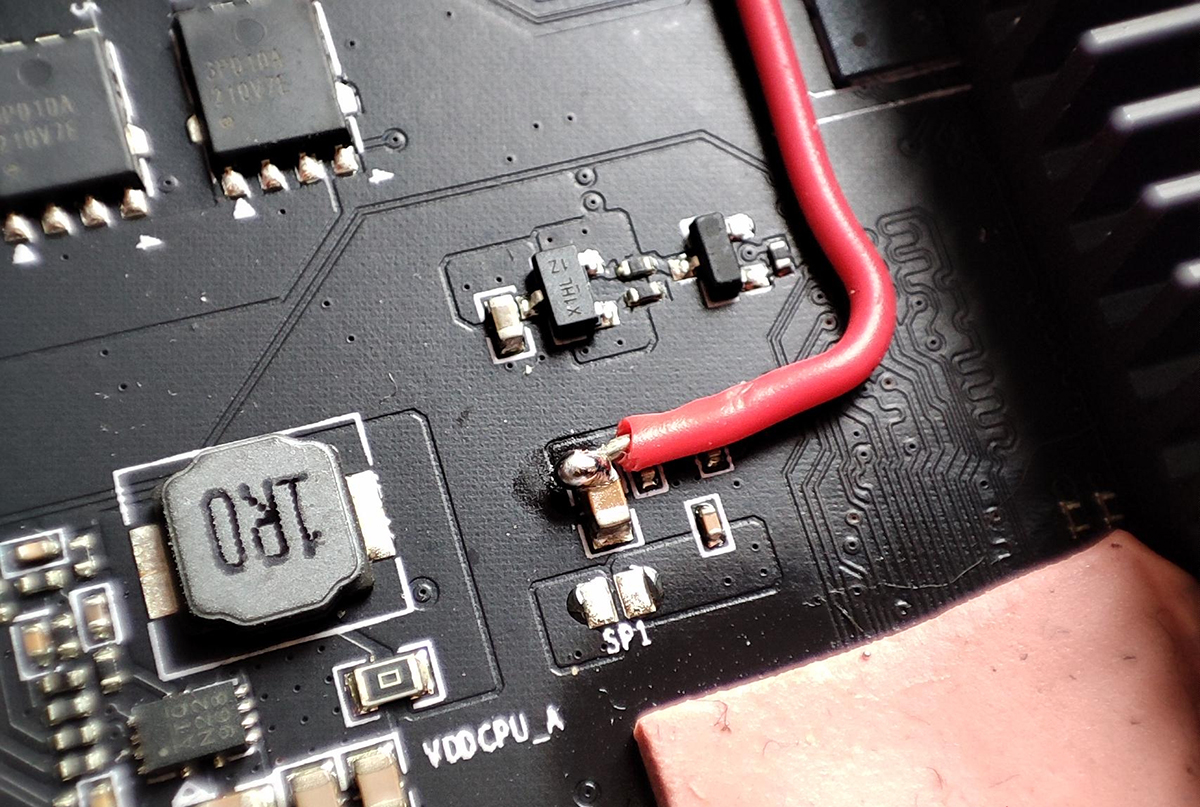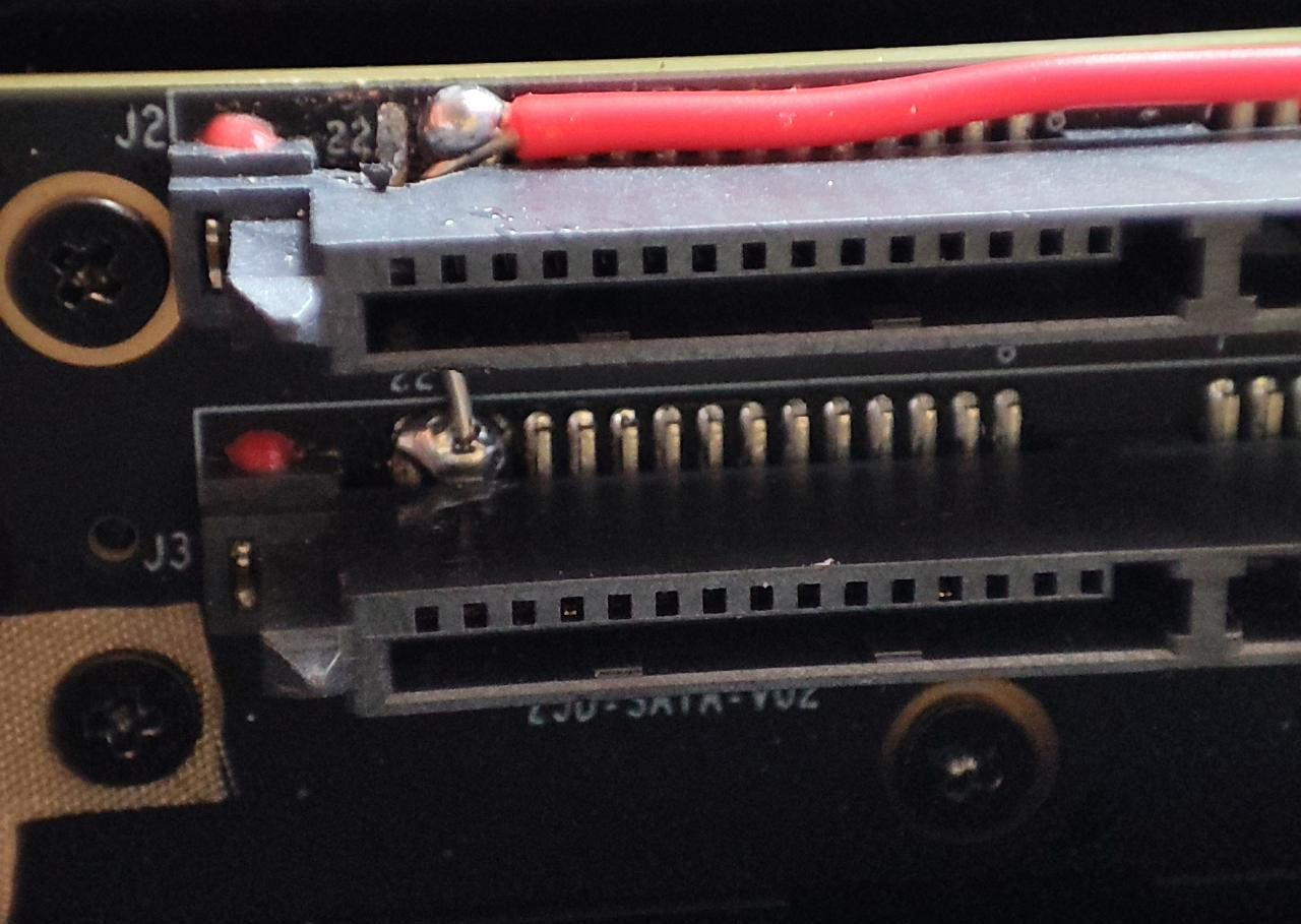 测量发现只有上排SATA接口最边上一根12V金手指被接地,下排正常。所以最终方案就是把对应那根SATA接口里面的金属舌拔掉,其余的5根金手指全接上12V就好了。